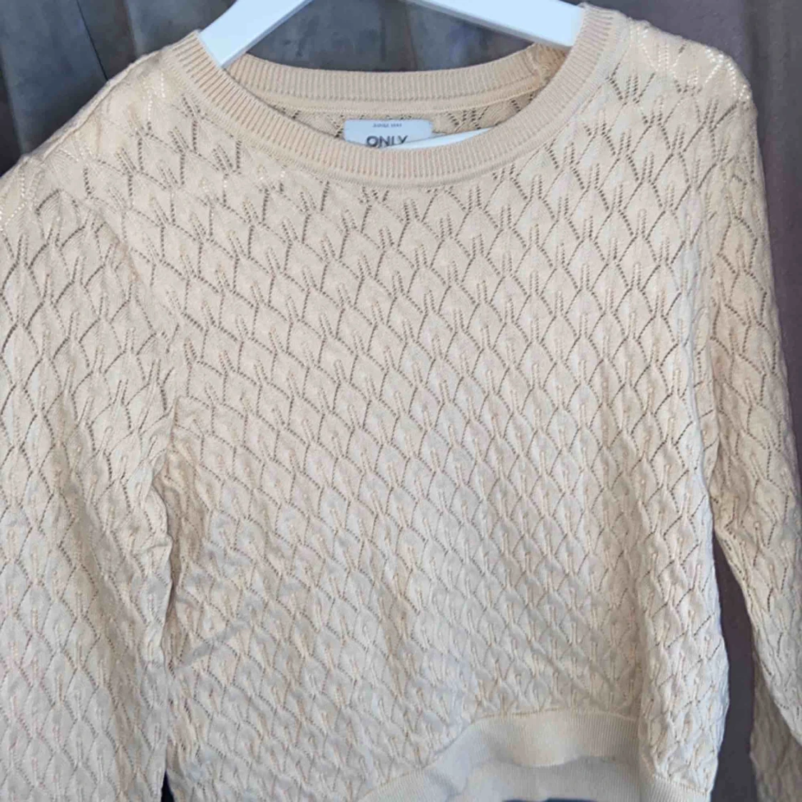 Beige stickad tröja som är köpt i höstas, använd ett fåtal gånger men väljer nu att sälja den då den inte används. Den är i superfint skick och superfin modell på den.