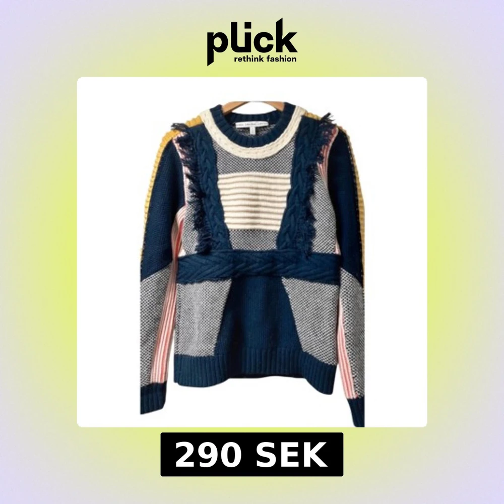 Unik stickad tröja med coola detaljer i marinblått, vitt, rosa och gult. Tröjan har flätstickade partier, ribbade muddar och mixade mönster med ränder på ärmarna. Perfekt för dig som gillar statement-plagg och vill sticka ut.