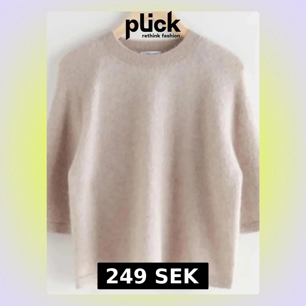 Säljer en beige stickad tröja från & Other Stories med rund hals och korta ärmar. Tröjan har en mjuk och fluffig känsla, perfekt för lager-på-lager under hösten eller vintern. Enkel design med ribbad kant vid halsen för en clean look. Förra ägaren sa att den kan ha krymt i tvätten lite så skulle säga att den är för någon som har xs.