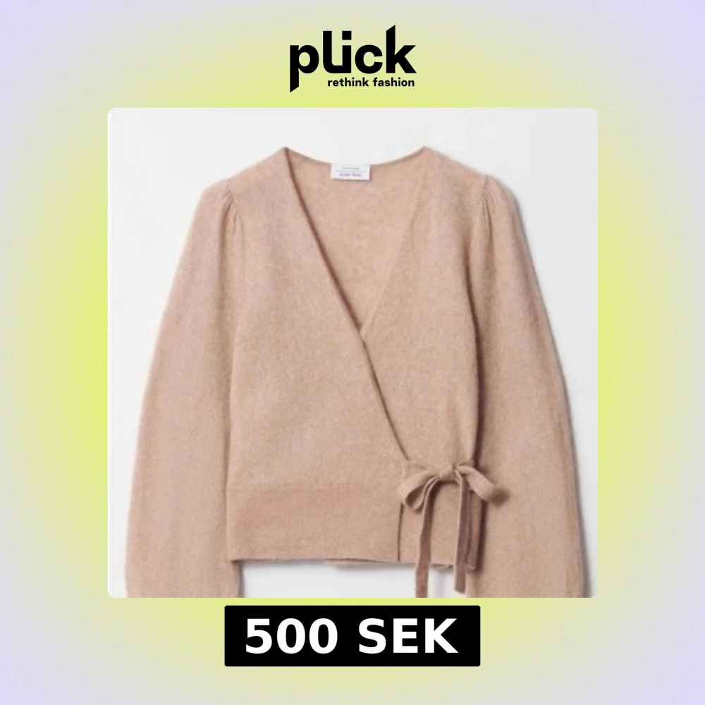 Supermysig beige omlottkofta från & Other Stories med v-ringning och knyt i sidan. Koftan har långärmade puffärmar och är stickad i mjukt material som känns lyxigt. Perfekt att slänga på sig när det är lite kyligt ute.