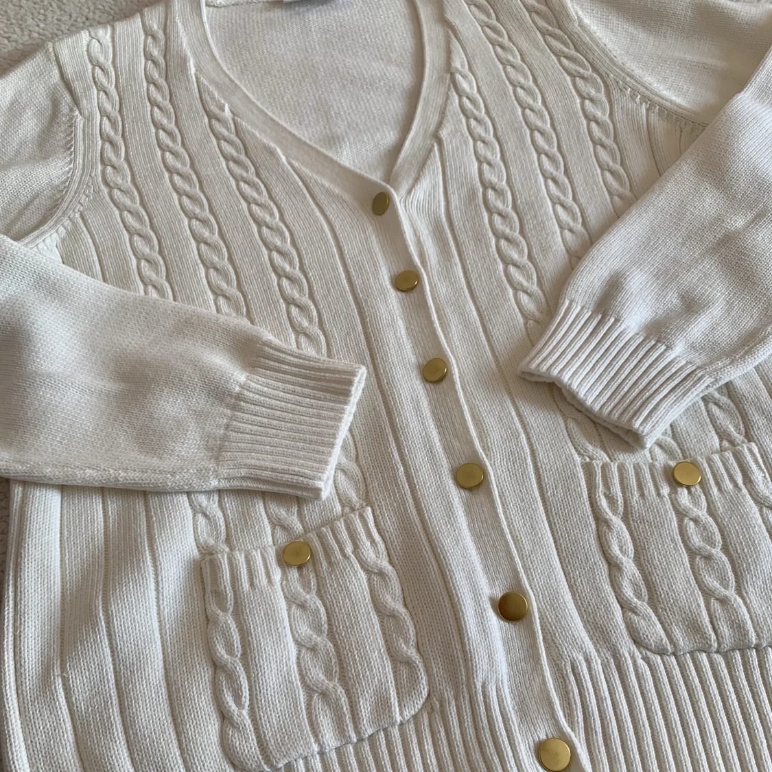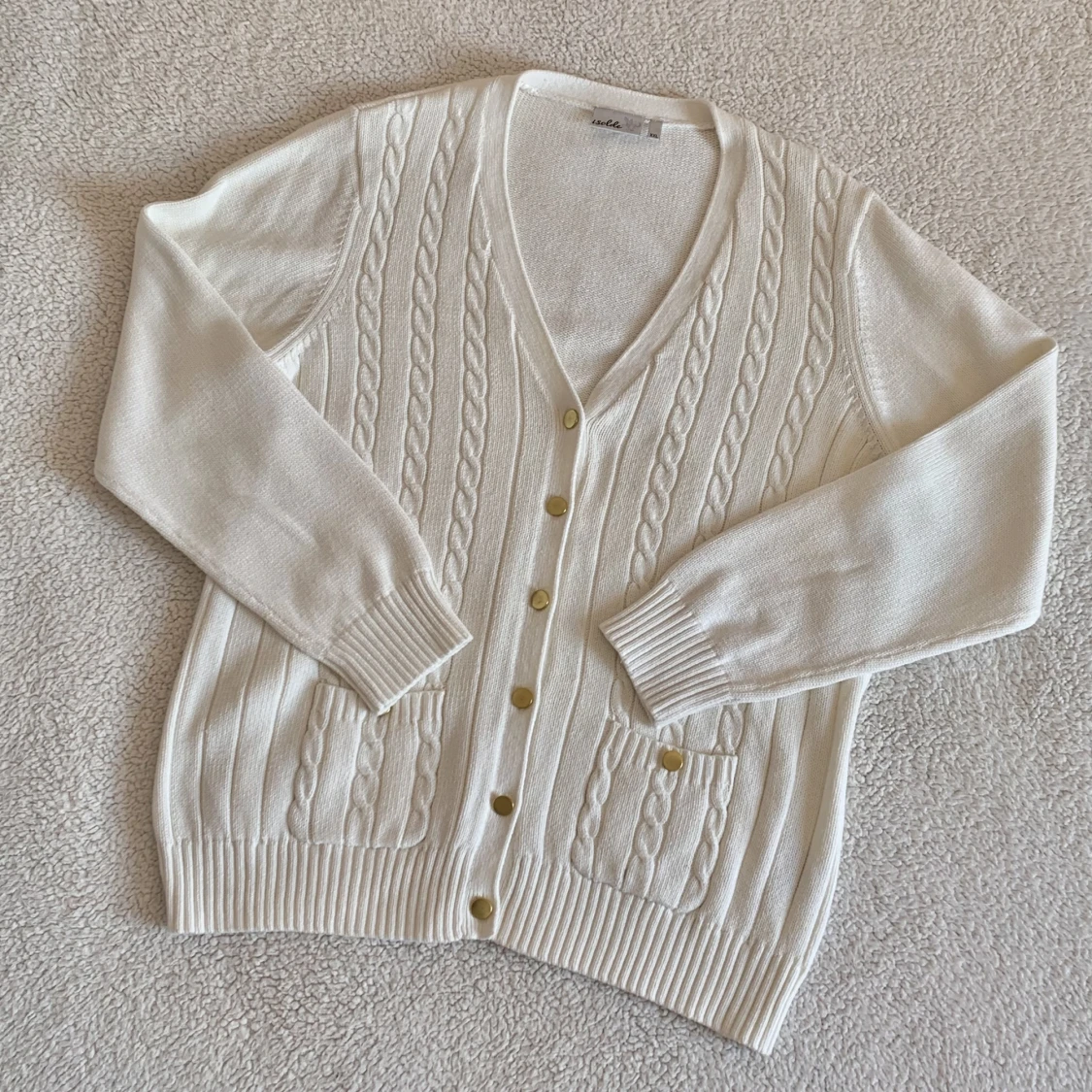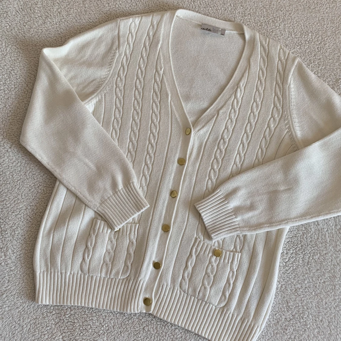 Jättesöt kabelstickad cardigan från Isolde. Storlek XXL men något mindre i storleken. Sitter väldigt snyggt oversize på mig som är XS/S. I nyskick utan anmärkningar. Perfekt cardigan till vår och sommar. 🌻