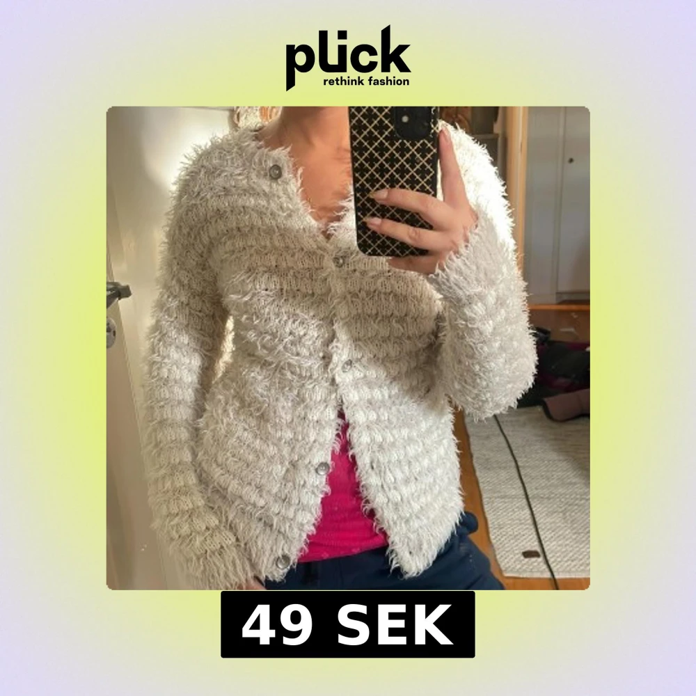 Supermysig fluffig vit kofta med knappar framtill. Koftan är stickad med ett lurvigt garn som ger en cool textur och har långa ärmar. Perfekt för lager-på-lager och att mysa i under kyliga dagar.
