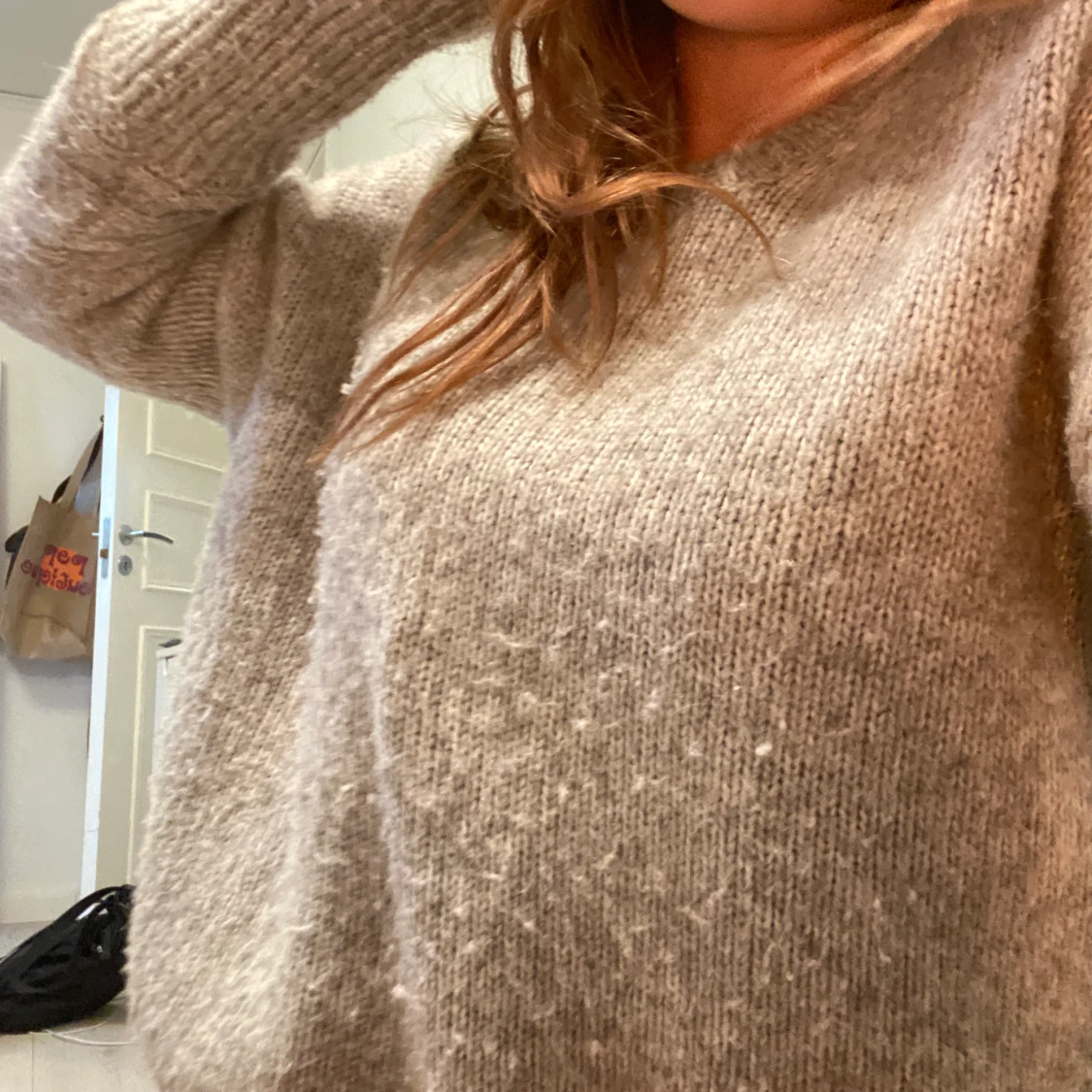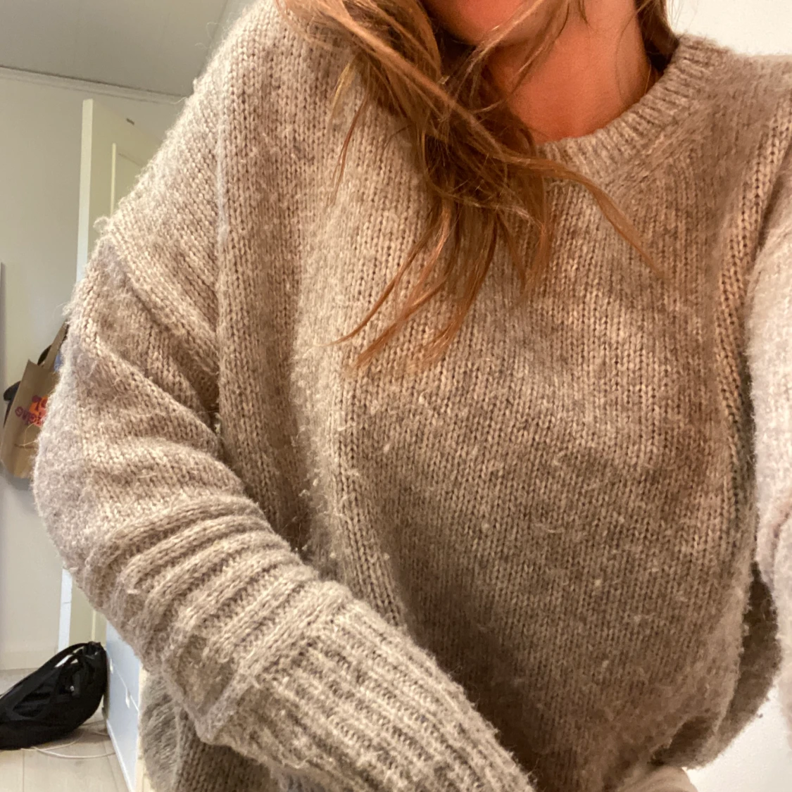 Grå stickad tröja med mönster på armarna. Använd och lite nopprig, se bild. Mycket skön