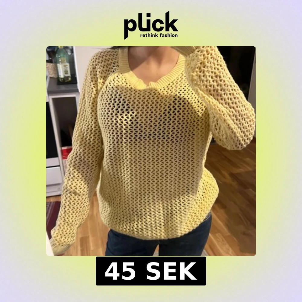 Säljer en ljusgul stickad tröja från Pieces i storlek S. Tröjan har ett öppet, nätliknande mönster och är långärmad med ribbade muddar vid hals och ärmslut. Perfekt för lager-på-lager och ger en chill vibe till din outfit.