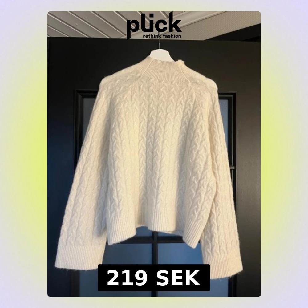 Säljer en vit stickad tröja från Carin Wester i storlek M. Tröjan har ett klassiskt flätmönster, hög ribbad hals och breda muddar vid ärmslut och nederkant. Perfekt för kyliga dagar och riktigt mysig att bära.