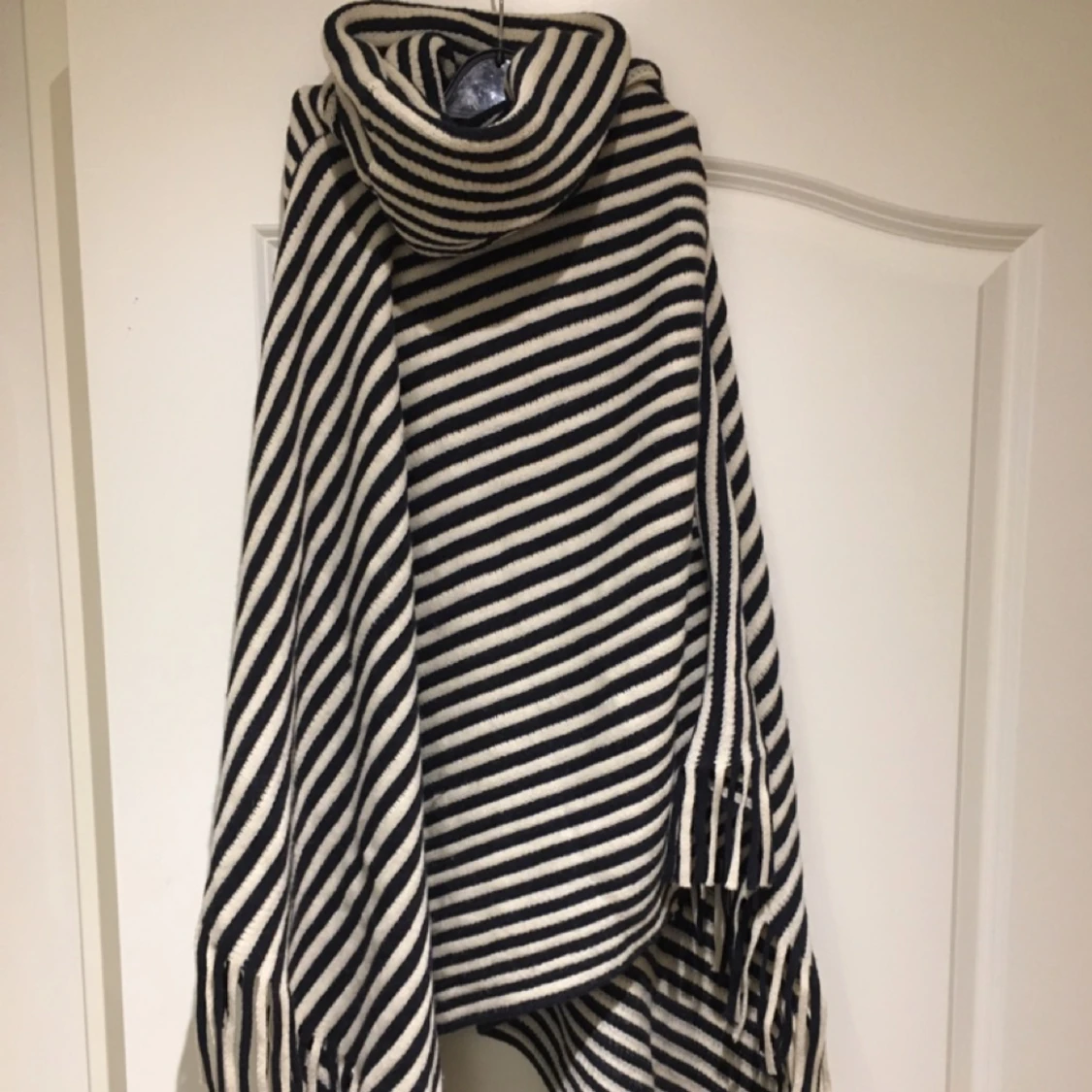 En poncho från Lindex. Ränder i vitt och marinblå. Köparen står för frakten.
