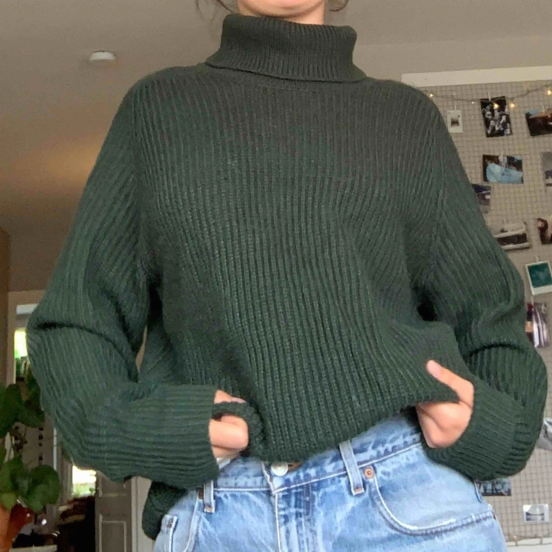 Mjuk stickad tröja med krage, grön färg. Köpt på POP i Stockholm deras egensydda plagg. Priset+frakt