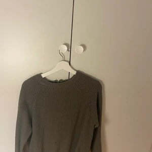 Olivgrön stickad tröja med blixtlås i ryggen. Inte sticksig men skön i materialet.