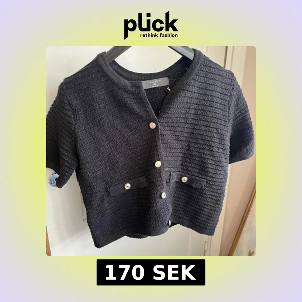Svart, ribbad kofta från Primark med korta ärmar och rund hals. Koftan har snygga silverfärgade knappar framtill och två dekorativa fickor. Materialet är stickat och ger en cool struktur. Perfekt för dig som gillar stilrena och trendiga plagg.