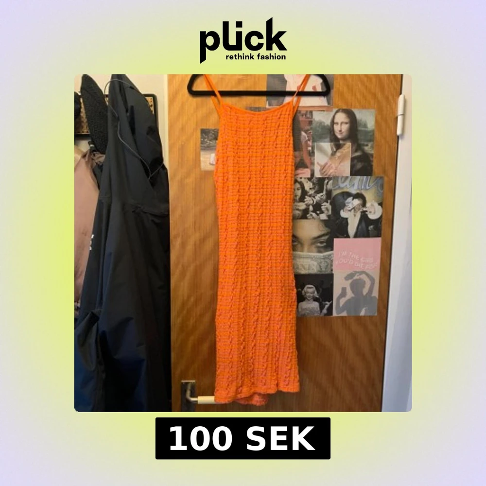 Säljer en orange stickad långklänning med smala axelband och öppen rygg med knyt. Klänningen har en rak passform och är perfekt för sommardagar. Den är virkad i ett mjukt material och har en snygg struktur.
