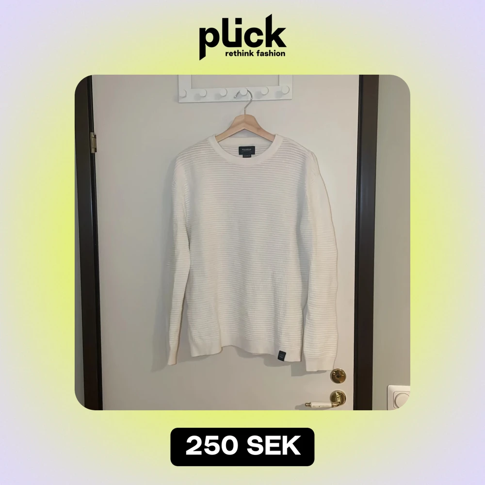 Säljer en stilren vit stickad tröja från Pull&Bear i mycket bra skick. Perfekt för både höst och vinter med sin mysiga och varma känsla. Tröjan har långa ärmar och en klassisk rund halsringning. Passar perfekt till både jeans och chinos för en avslappnad look. Pris går alltid att förhandlas!
