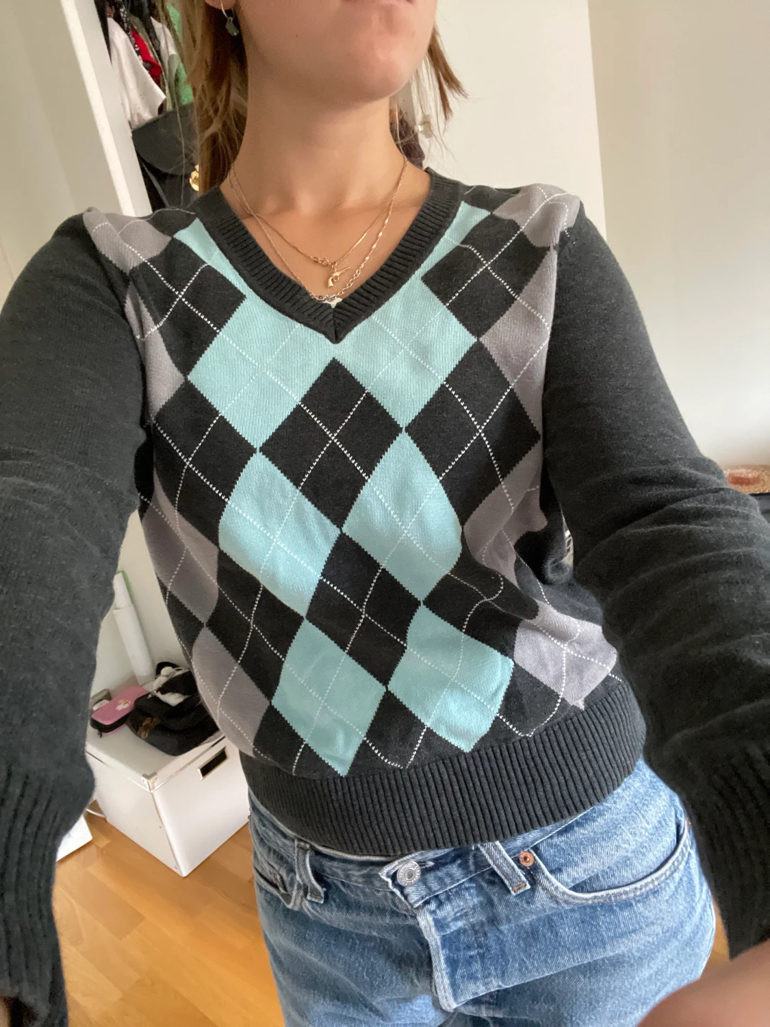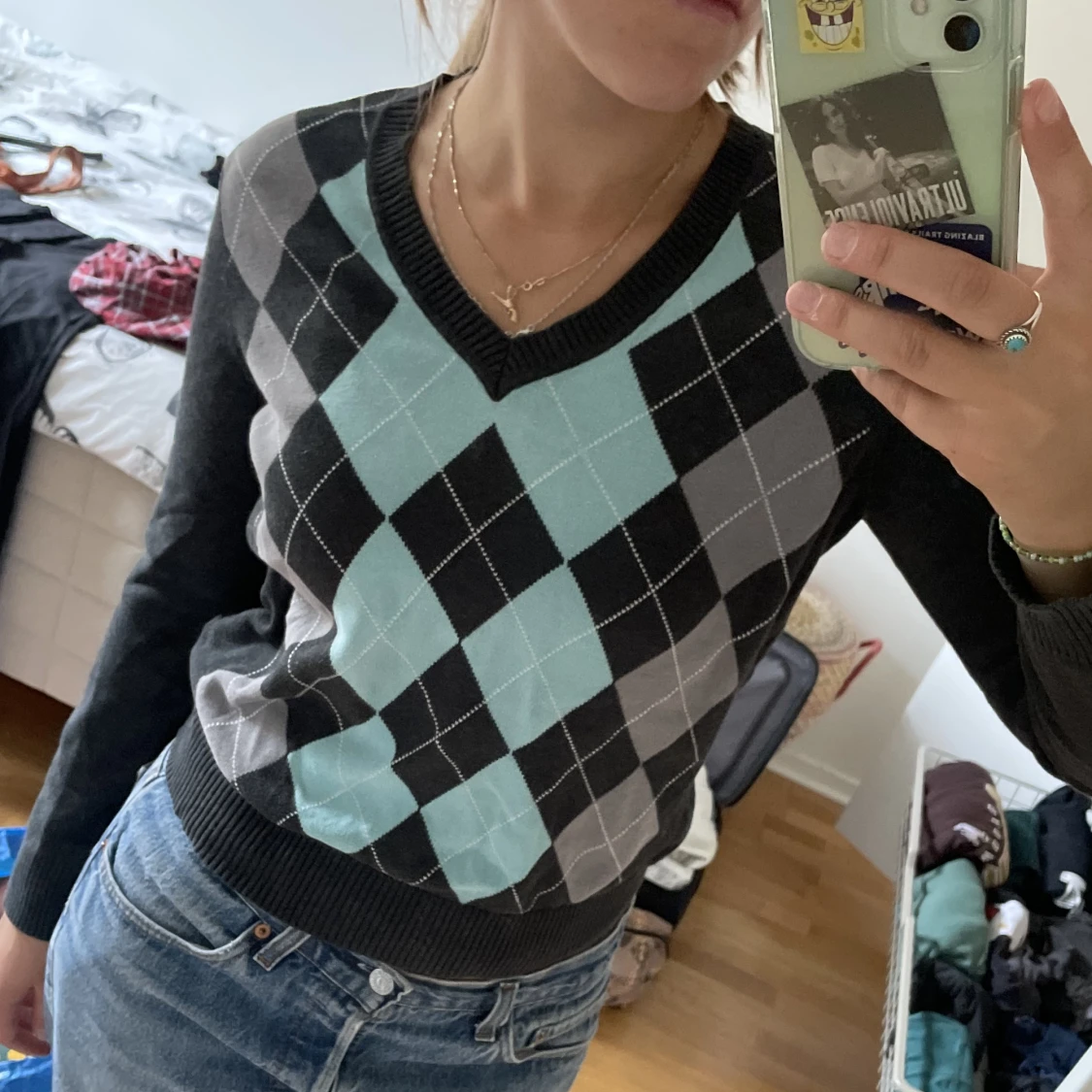 Stickad tröja med rutmönster, fint skick. Passar S/M.