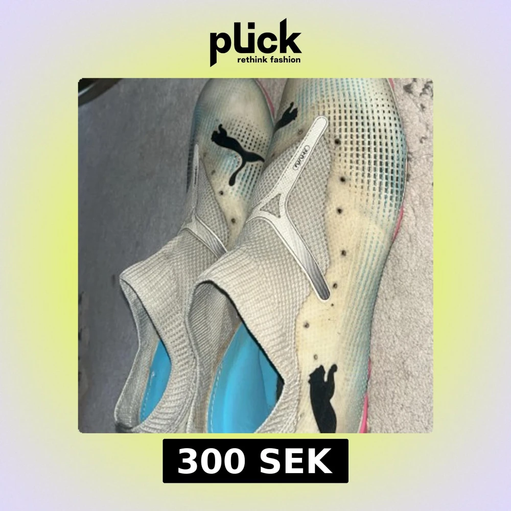 Säljer ett par gråa och ljusblå fotbollsskor från Puma med stickad ovandel och svart Puma-logga. Skorna har en strumpliknande passform, rosa dobbar och grafiska detaljer på sidan. Perfekt för dig som vill ha snygga och bekväma skor på planen.