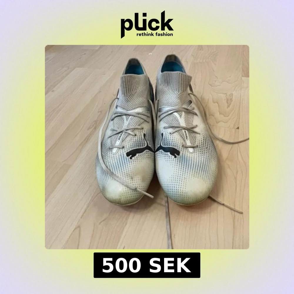 Säljer ett par vita Puma fotbollsskor med svart logga på sidan och ovansidan. Skorna har snörning, stickad strumpliknande krage och rosa dobbar undertill. Lätta och smidiga för snabba rörelser på planen. Perfekta för dig som vill sticka ut med stil på matchen.