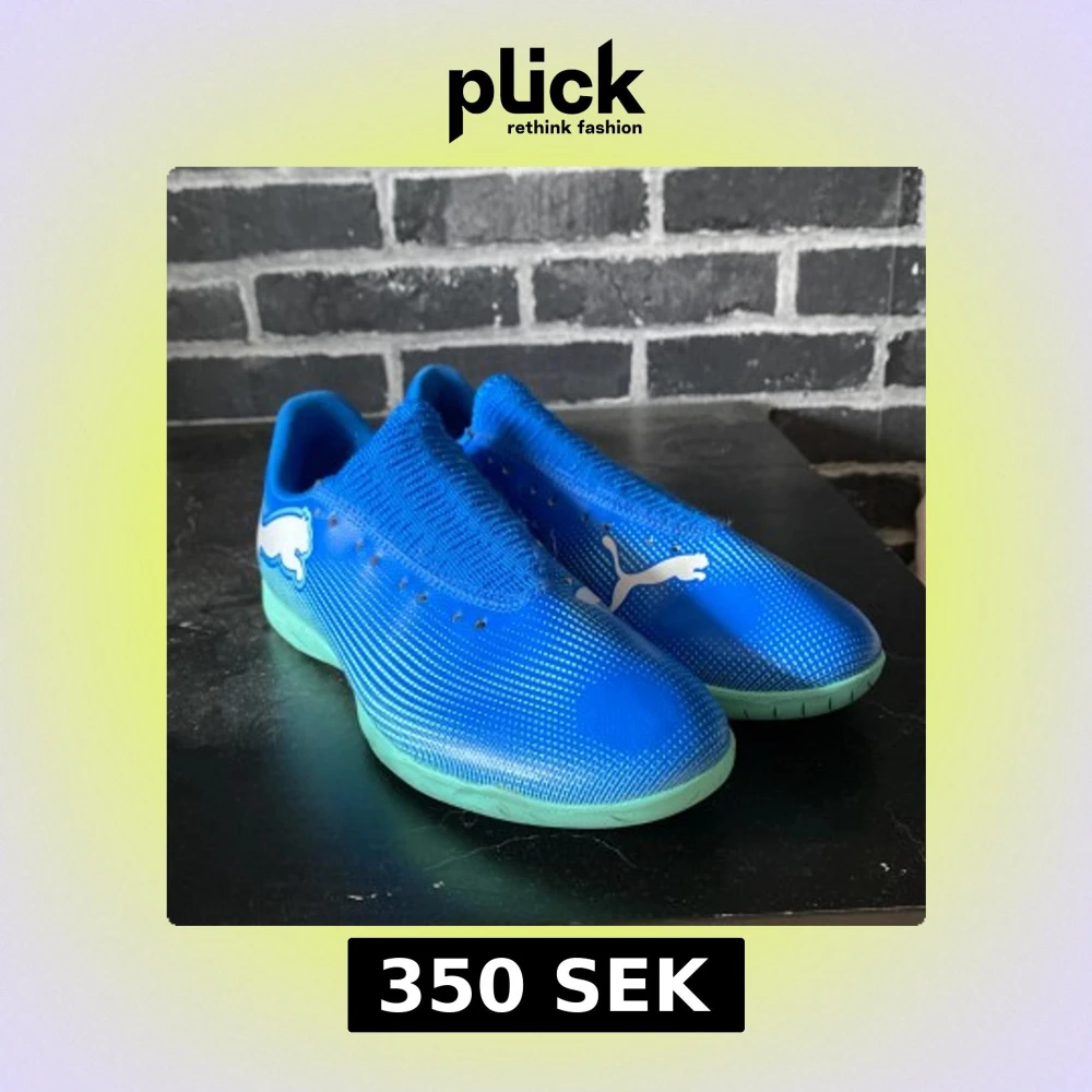 Snygga blåa inomhusfotbollsskor från Puma med turkos sula och vita detaljer. Skorna har en stickad ovandel för skön passform och cool design med stora loggor på sidan. Perfekta för dig som vill sticka ut på planen och ha bra grepp inomhus.