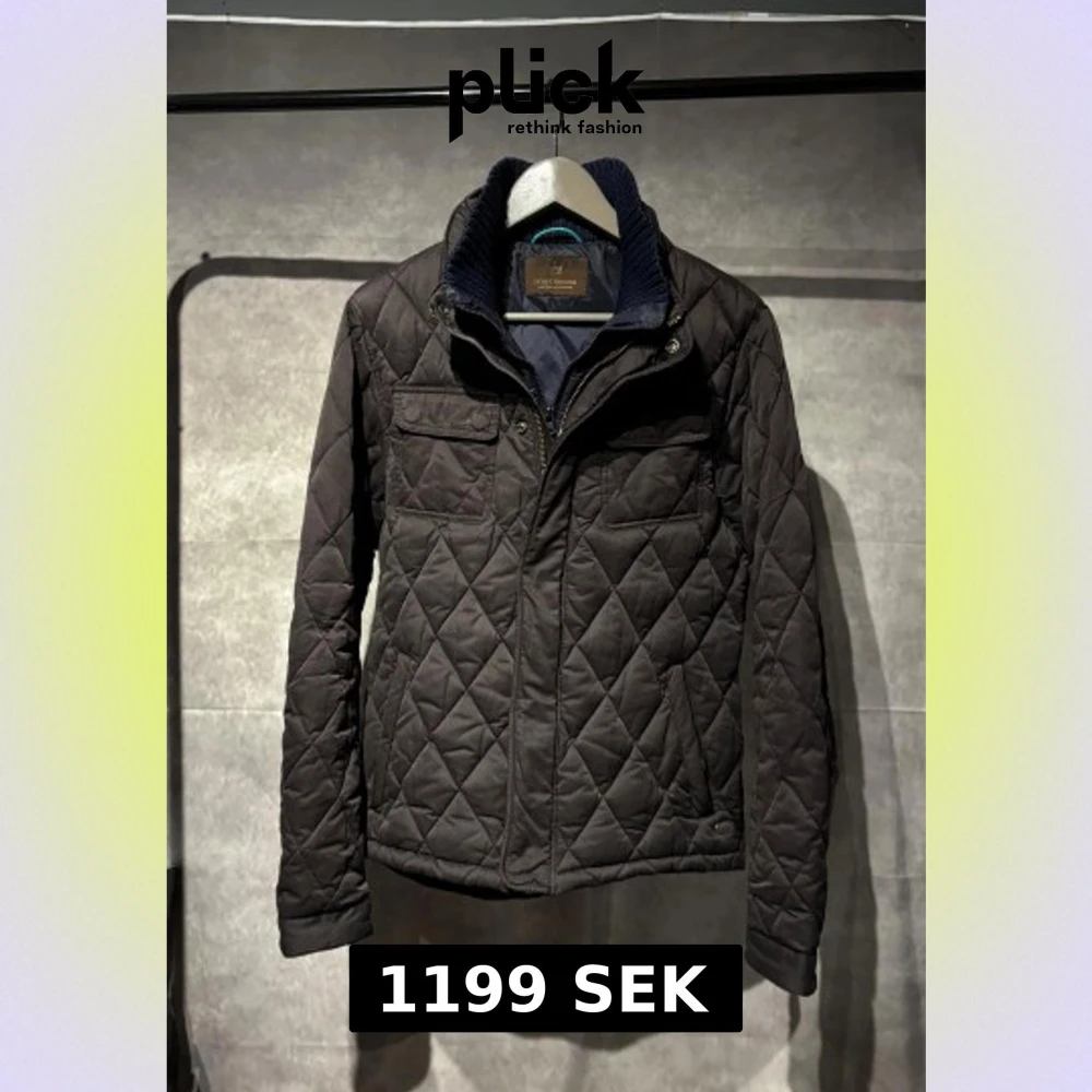 Quiltad jacka från Scotch & Soda i mörkgrå färg med marinblå stickad krage. Jackan har dragkedja och tryckknappar, två bröstfickor med lock och sidofickor. Materialet är polyester och insidan är fodrad i blått. Perfekt för höst och vinter.