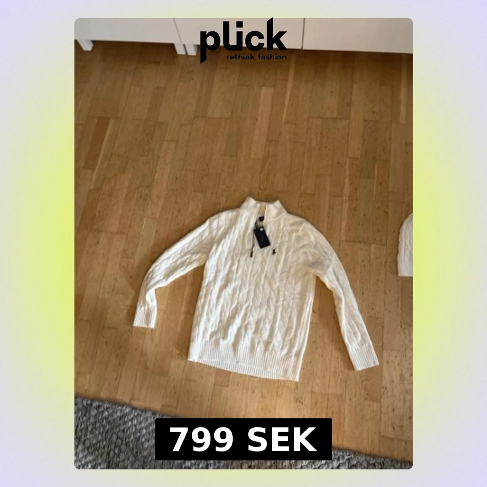 Säljer en vit stickad tröja från Polo Ralph Lauren i storlek L. Tröjan har ett snyggt kabelstickat mönster, half zip-dragkedja och ribbad krage. Klassisk logga broderad på bröstet. Perfekt för dig som gillar stilrena och tidlösa plagg.