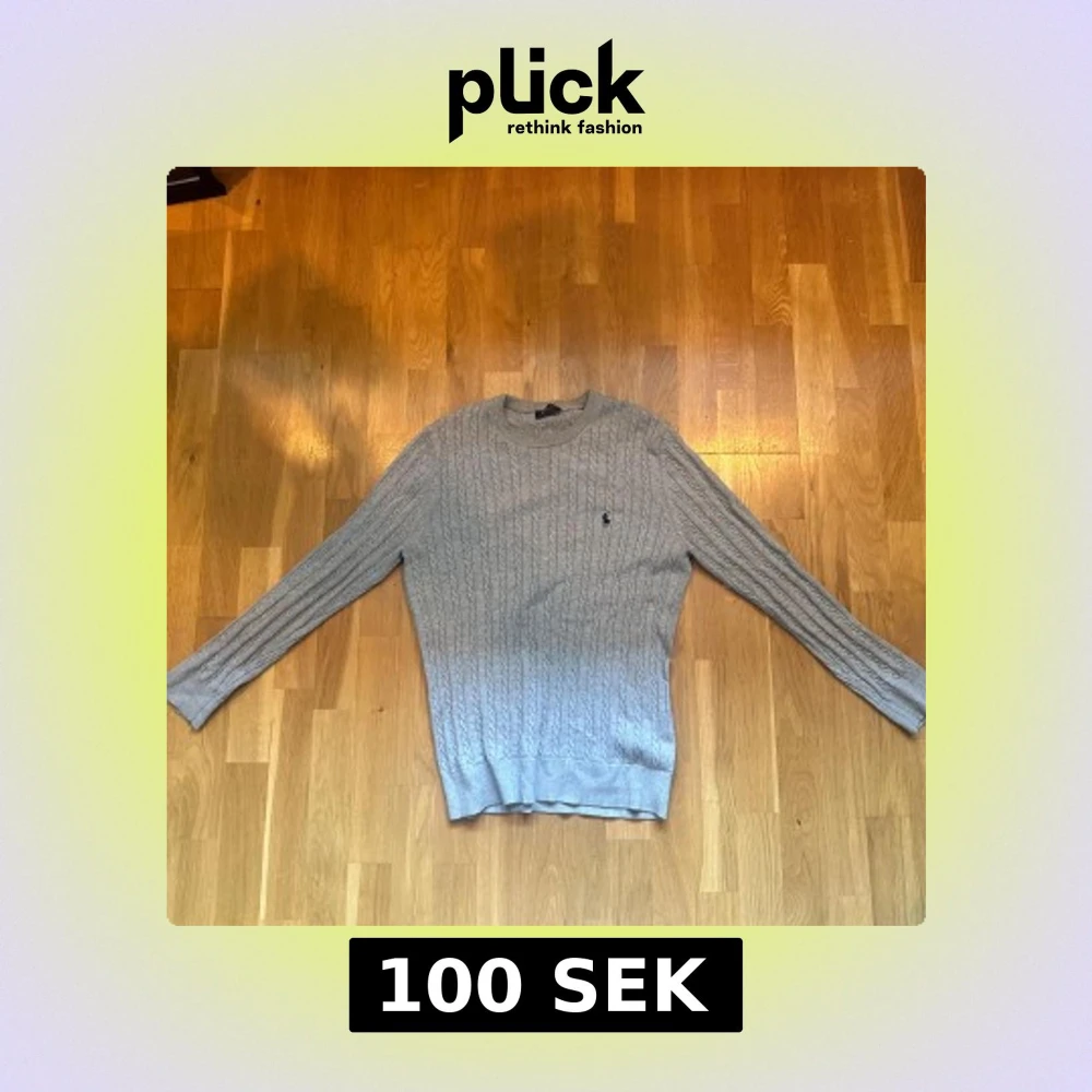 Snygg grå kabelstickad tröja från Ralph Lauren med klassisk rund halsringning och diskret logga broderad på bröstet.