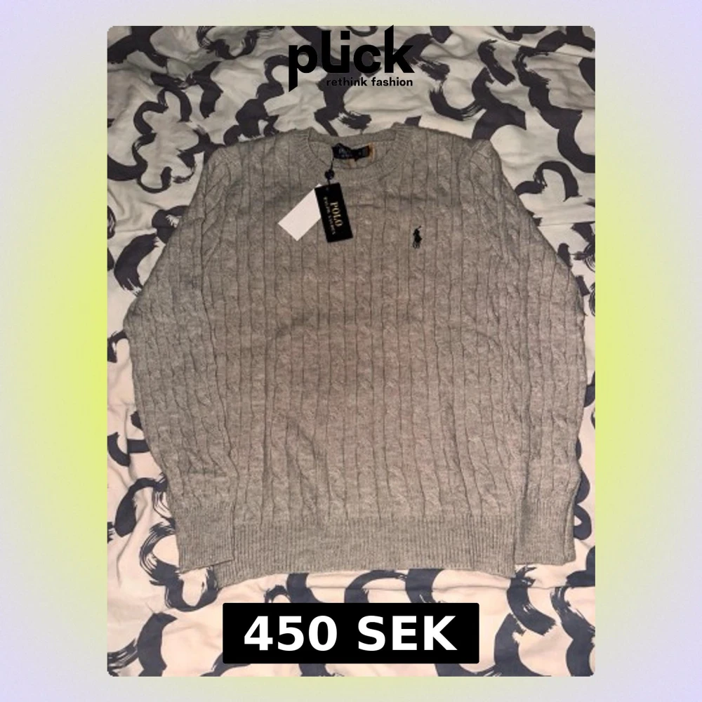 Säljer en grå kabelstickad tröja från Polo Ralph Lauren i storlek M. Tröjan har rund hals, diskret logga på bröstet och ribbade muddar. Perfekt för dig som gillar klassisk och clean stil.