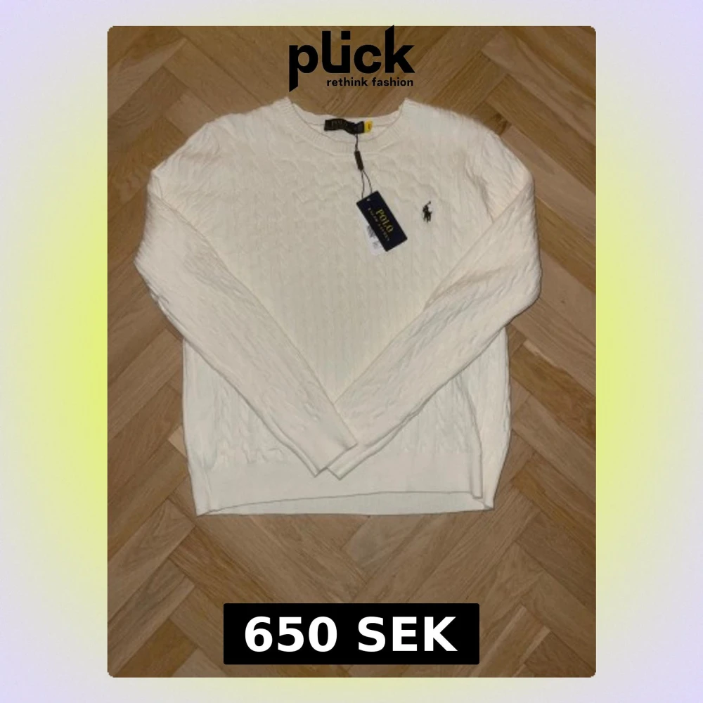 Vit stickad tröja från Polo Ralph Lauren med klassiskt kabelstickat mönster och rund hals. Tröjan har långärmade ärmar och den ikoniska Polo-loggan broderad på bröstet. Perfekt för dig som gillar stilrena och tidlösa plagg.