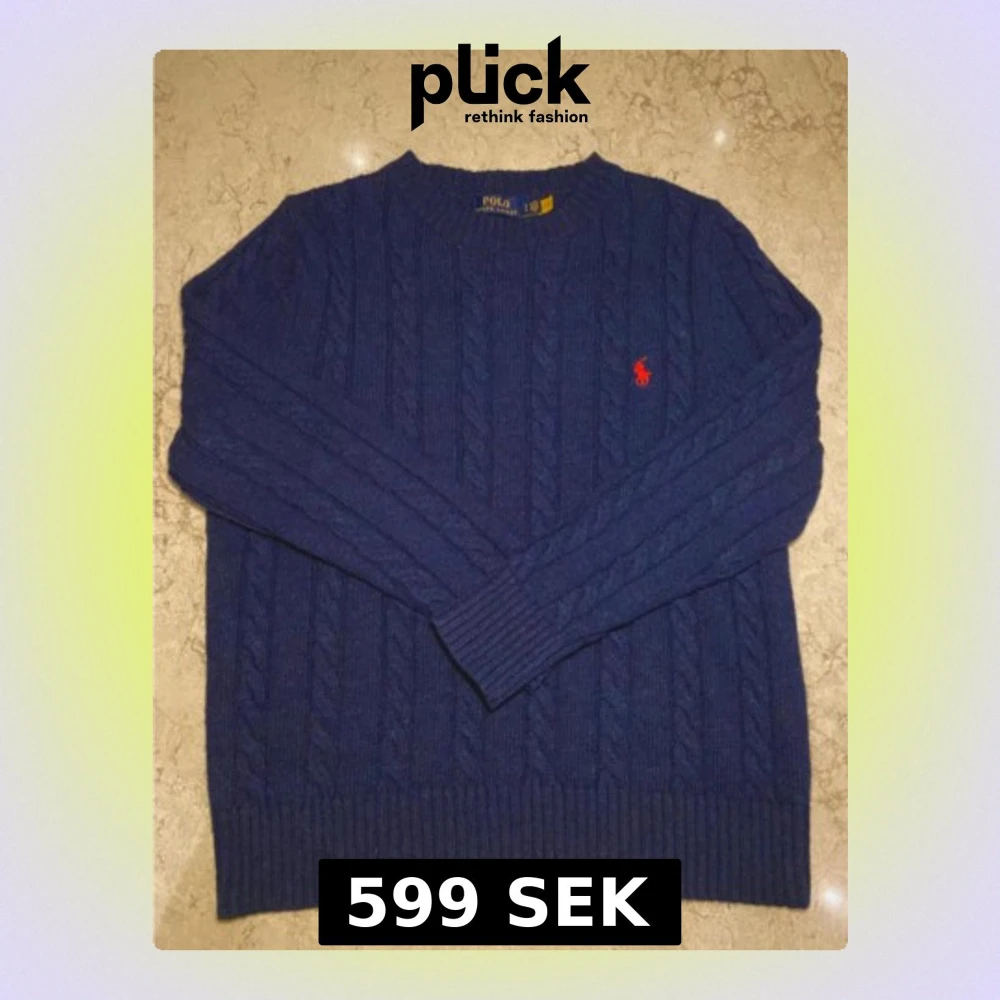Säljer en marinblå stickad tröja från Polo Ralph Lauren i storlek S. Tröjan har kabelstickat mönster, rund hals och en röd broderad logga på bröstet. Långa ärmar och ribbade muddar ger en klassisk look. Perfekt för dig som gillar stilrena och tidlösa plagg.