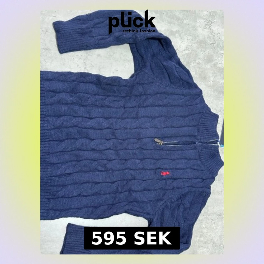 Säljer en marinblå kabelstickad tröja från Polo Ralph Lauren med halv dragkedja och röd broderad logga på bröstet. Tröjan har lång ärm, ribbade muddar och är gjord i mjuk bomull. Perfekt för lager-på-lager under hösten och vintern.