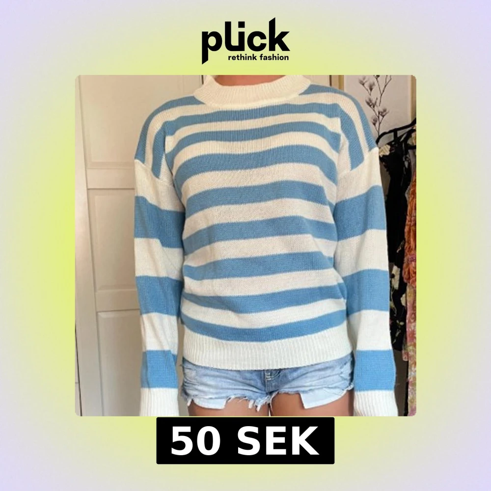 Säljer en stickad tröja från SHEIN i storlek S med breda blå och vita ränder. Tröjan har rund hals, långa ärmar och ribbade muddar vid hals, ärmslut och nederkant. Perfekt för dig som gillar chill och enkel stil.