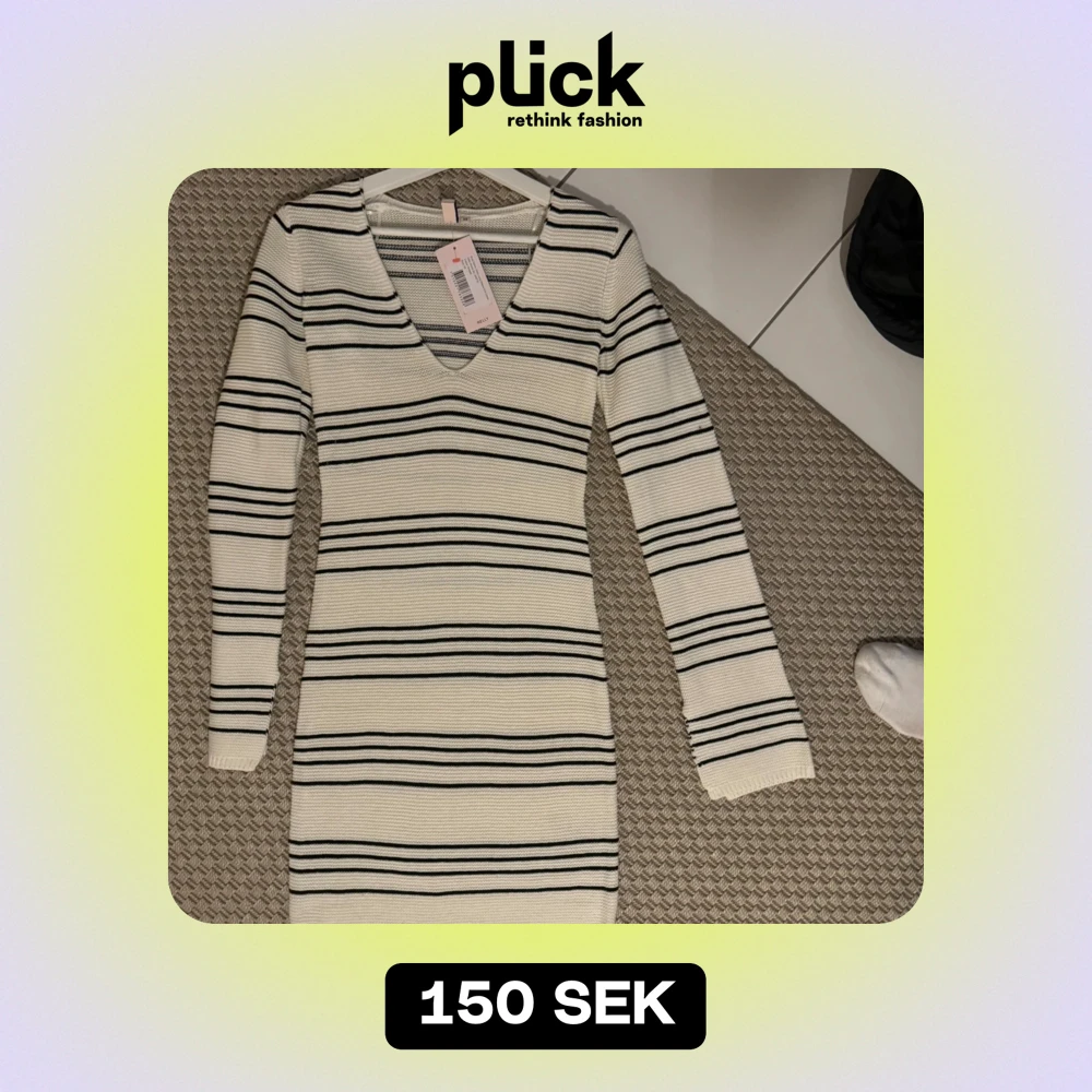 Oanvänd randig klänning från Nelly i storlek XS. Den är vit med svarta ränder och har en v-ringad hals.