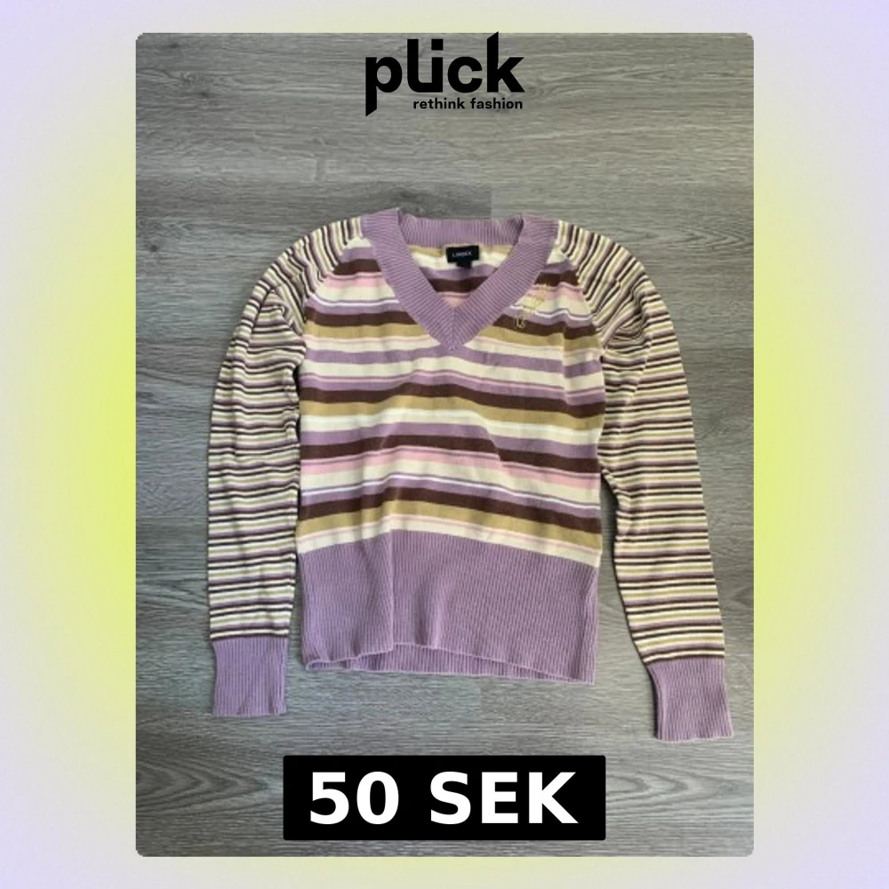 Säljer en snygg randig tröja från Lindex i storlek XS. Tröjan har lila, beige, brun och vit som basfärger, bred ribbad v-ringad hals och muddar. Materialet är mjukt och stickat, perfekt för dig som gillar retrovibbar och färg. Långärmad och med cool broderad detalj vid axeln.