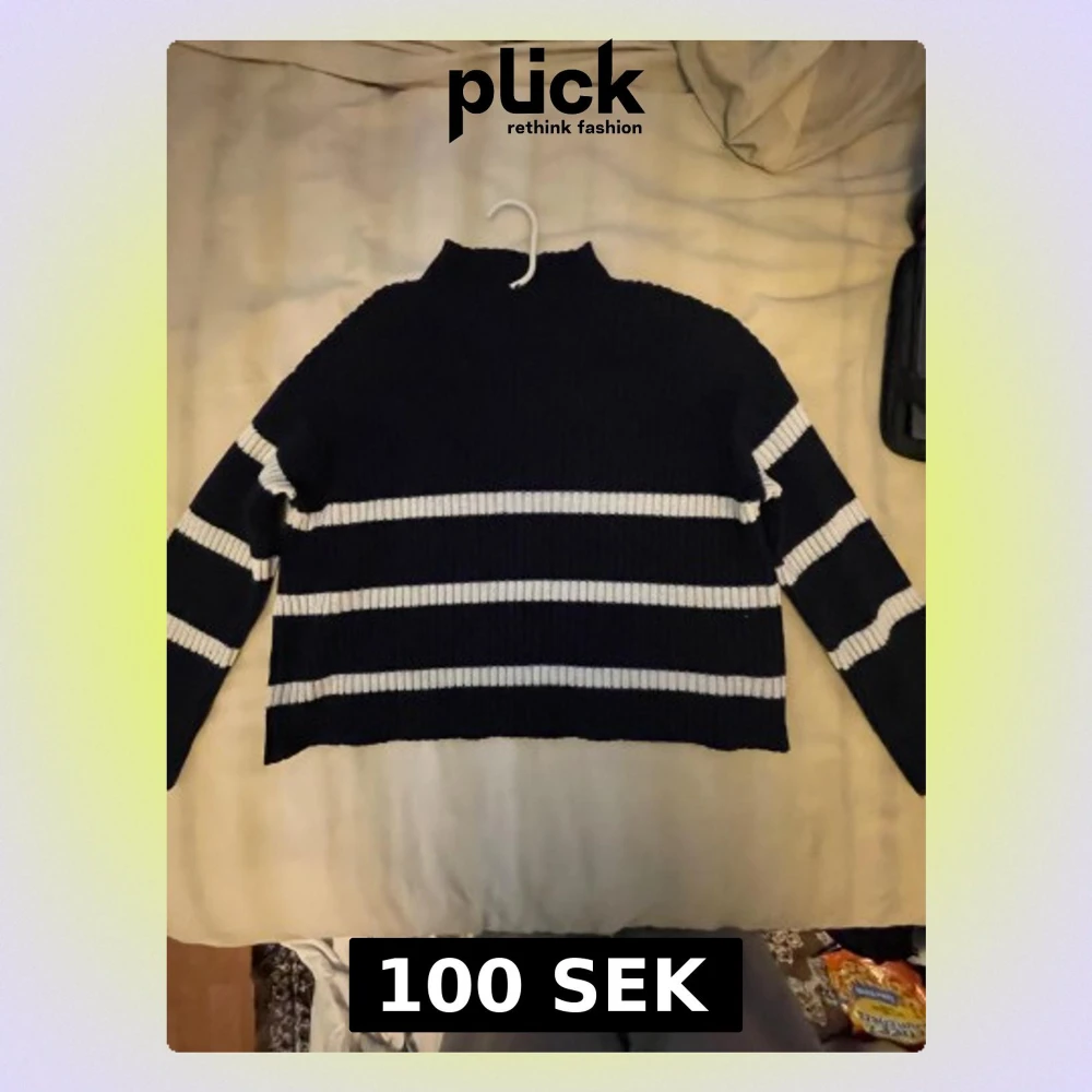 Säljer en ribbstickad tröja i mörkblått med vita horisontella ränder. Tröjan har lång ärm, lite högre hals och en loose passform som ger en chill vibe. Perfekt för dig som gillar klassiska mönster och vill ha något mjukt och bekvämt.