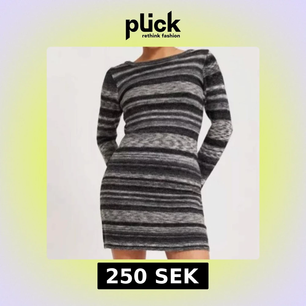 Snygg stickad klänning med randigt mönster i olika grå nyanser. Klänningen har en åtsittande passform och långärmad design med en elegant öppen rygg. Perfekt för kyligare dagar.