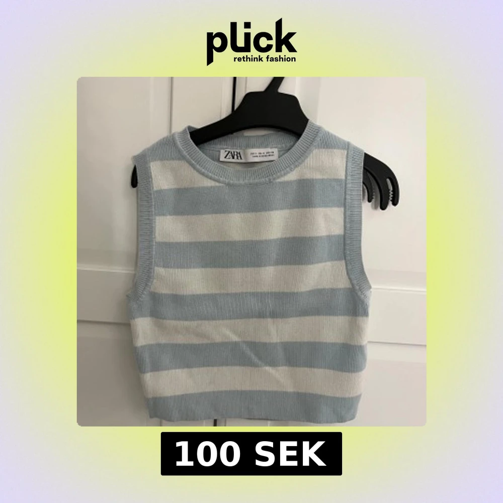 Säljer en stickad linnetopp från Zara i ljusblått och vitt med breda horisontella ränder. Toppen är ärmlös och har en rund halsringning. Perfekt för varmare dagar och enkel att matcha med jeans eller kjol.