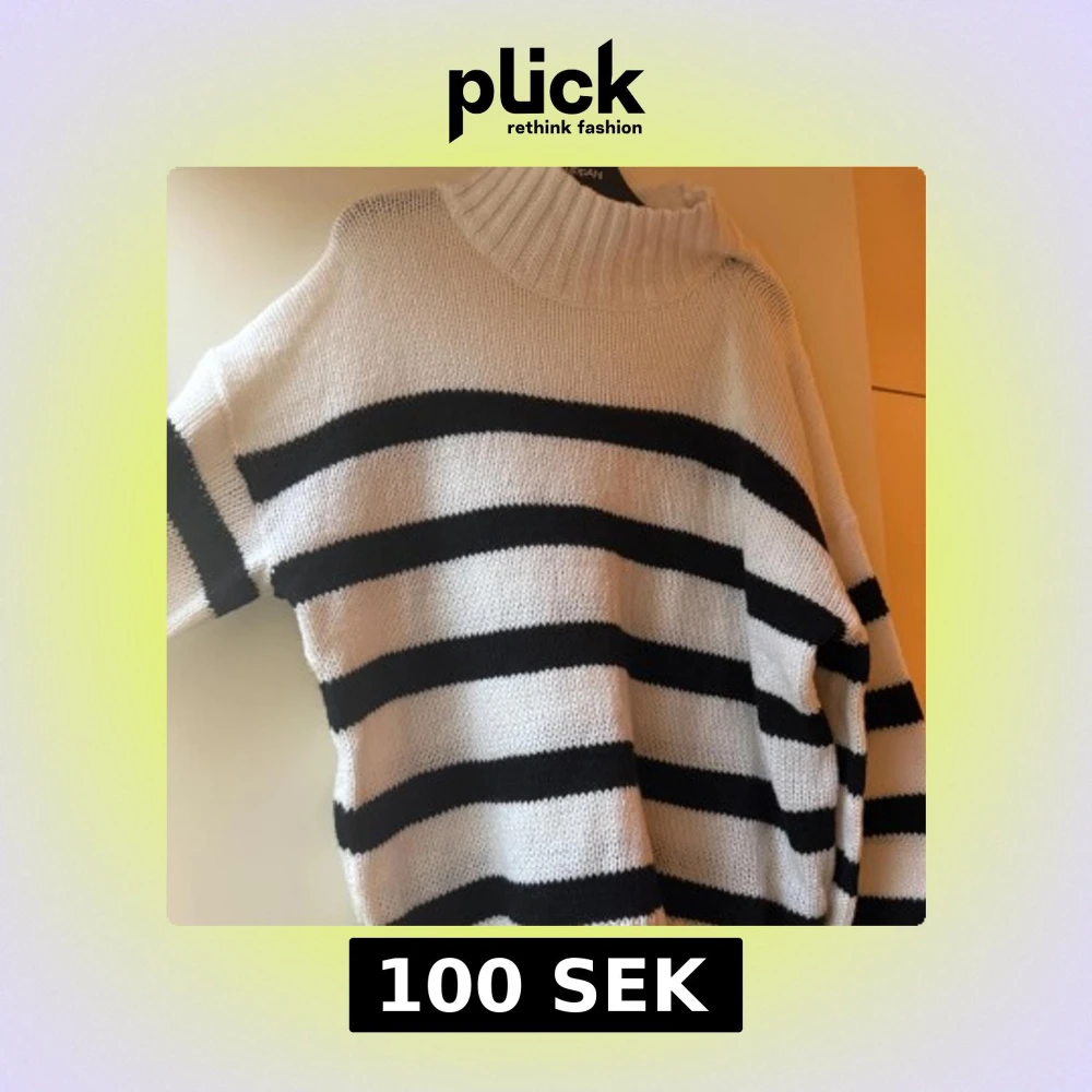 Säljer en stickad polotröja med breda svarta och vita ränder. Tröjan har hög krage och långa ärmar, perfekt för kyliga dagar. Oversized passform för en chill och trendig look.