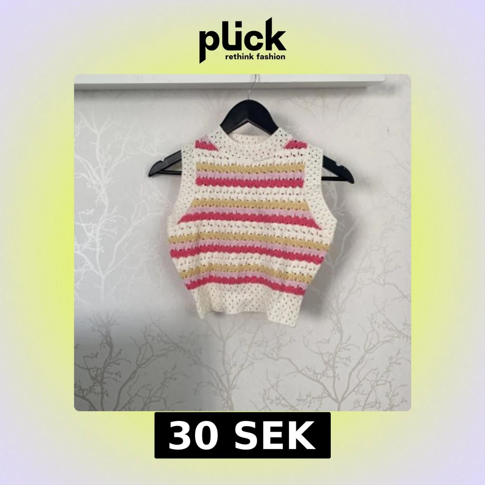 Säljer en croppad, ärmlös stickad topp från SHEIN med färgglada ränder i vitt, rosa, ljuslila och beige. Toppen har hög hals och ett luftigt, virkat mönster som ger en chill vibe. Perfekt för dig som gillar färg och vill sticka ut lite extra.