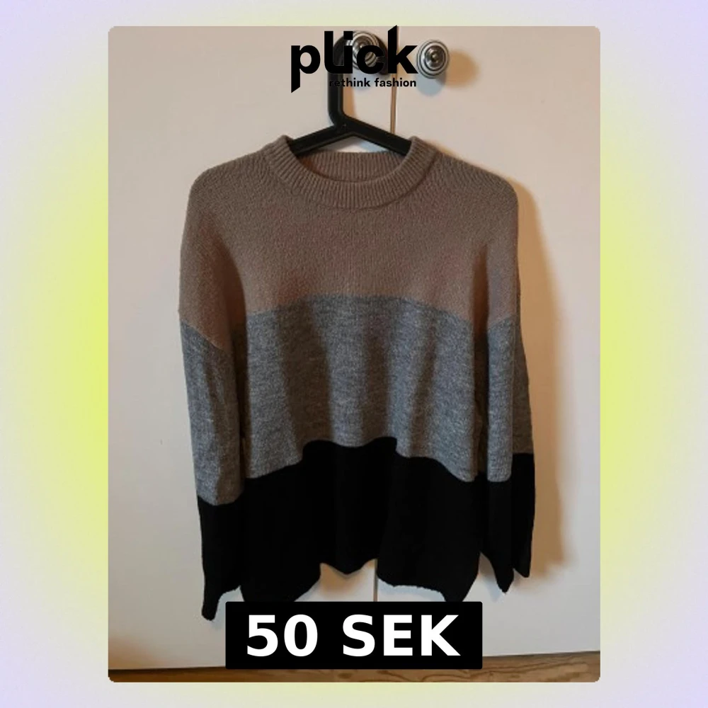Säljer en stickad tröja från Lager 157 i storlek S. Tröjan har breda blockränder i beige, grått och svart, rund halsringning och lång ärm. Perfekt för dig som gillar en chill och avslappnad stil.