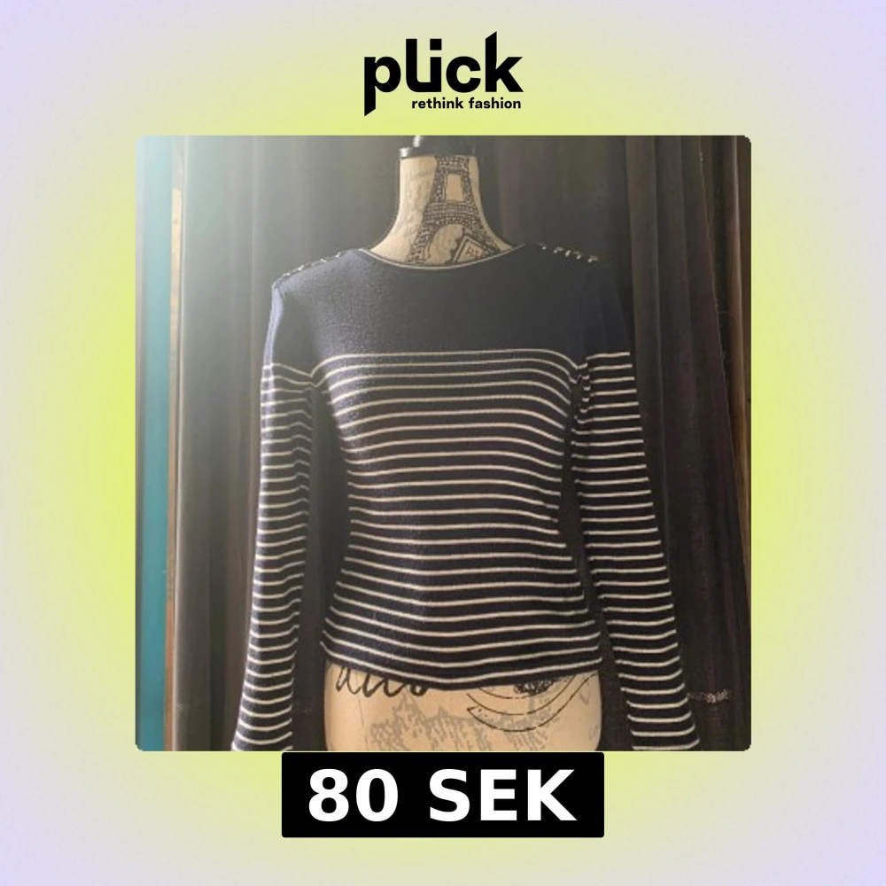 Mörkblå och vit randig stickad tröja från BikBok i storlek XS. Tröjan har lång ärm, rund halsringning och snygga guldfärgade knappar på axlarna. Perfekt för dig som gillar klassisk stil med en twist. Lite nopprig men inget som man märker av, använd ett fåtal gånger