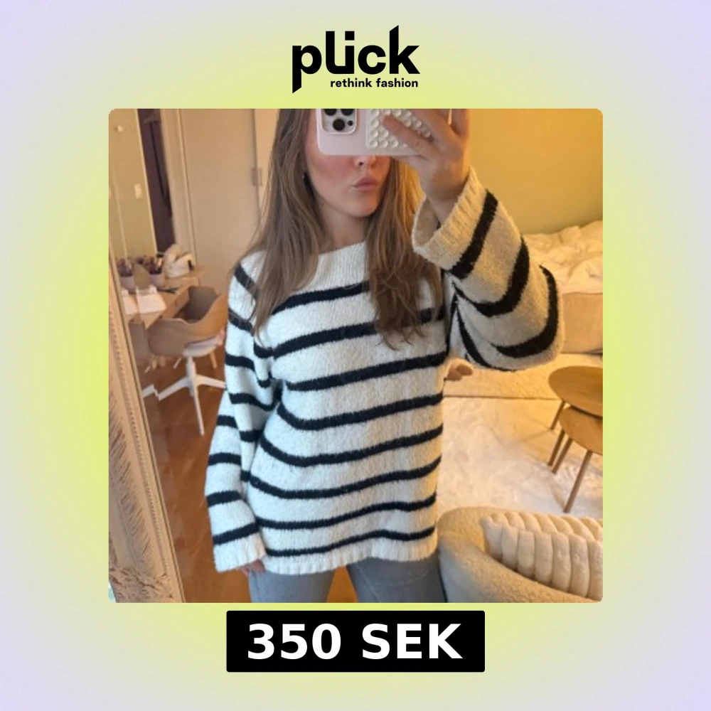 Mysig stickad tröja från BikBok i vitt med svarta horisontella ränder. Tröjan har en loose passform, långa ärmar och rund halsringning. Den är i storlek S, men är som sagt lite loose, så passar säkert S-L