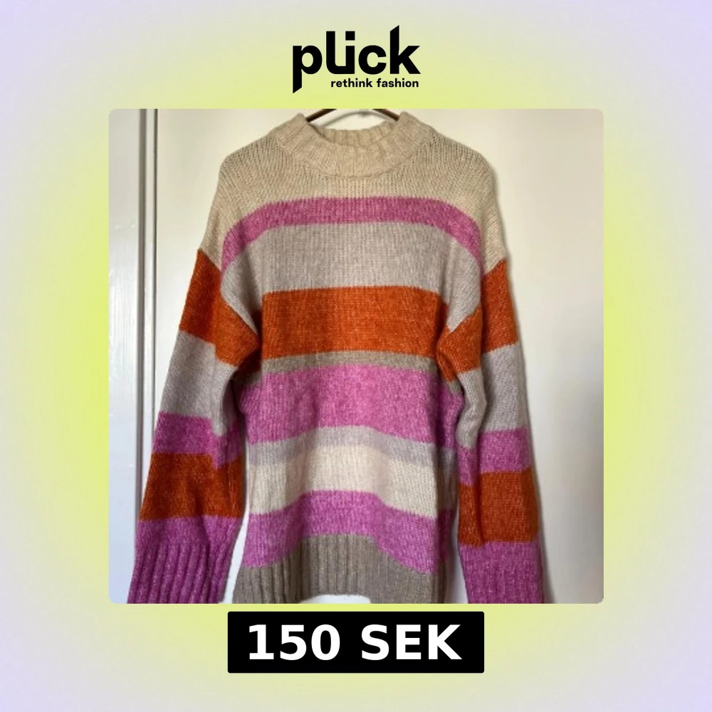 Supermysig oversized stickad tröja från H&M med breda ränder i beige, orange och rosa. Tröjan har hög krage, lång ärm och ribbade muddar. Mjukt material. Jättefina färger till hösten. Använd 1 gång. Passar s/m.