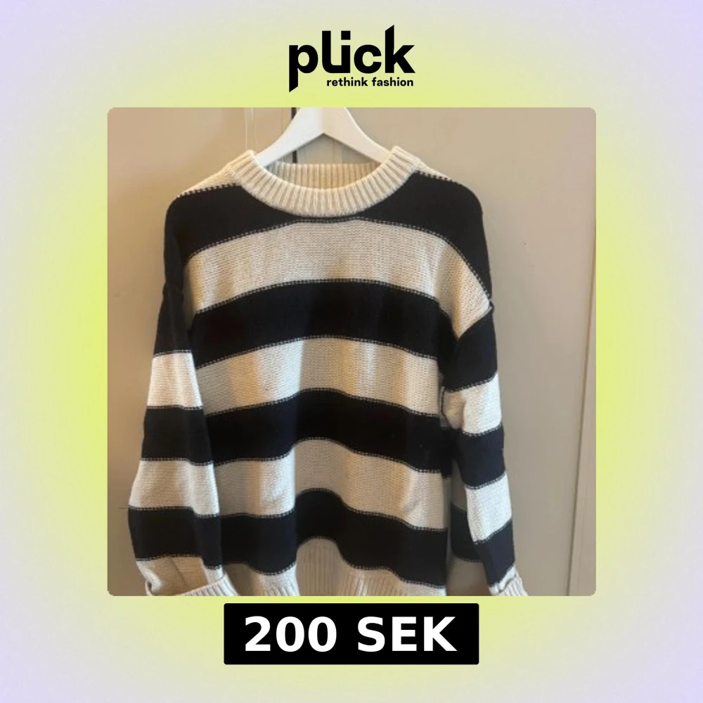 Säljer en oversized stickad tröja från H&M i svart och vitt med breda ränder. Tröjan har rund halsringning, långa ärmar och är gjord i en mjuk ull- och kashmirblandning. Perfekt för kyliga dagar och superenkel att styla till jeans eller kjol.