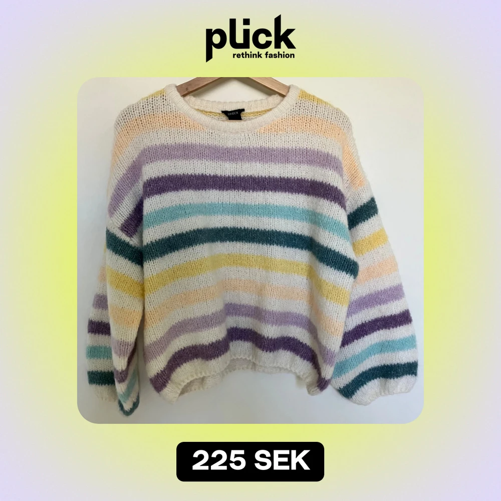 Superfin stickad tröja från Lindex i storlek S. Den har ett färgglatt randigt mönster i pastellfärger som lila, grön, gul och vit. Perfekt för att liva upp garderoben! Tröjan är mjuk och bekväm med långa ärmar, perfekt för kyliga dagar.