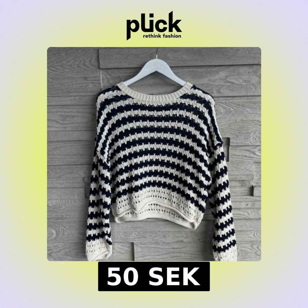 Säljer en stickad tröja från Pull&Bear i storlek M. Tröjan är randig i marinblått och vitt, har lång ärm och en avslappnad passform. Ribbad kant vid halsen och nederdelen ger extra detalj.