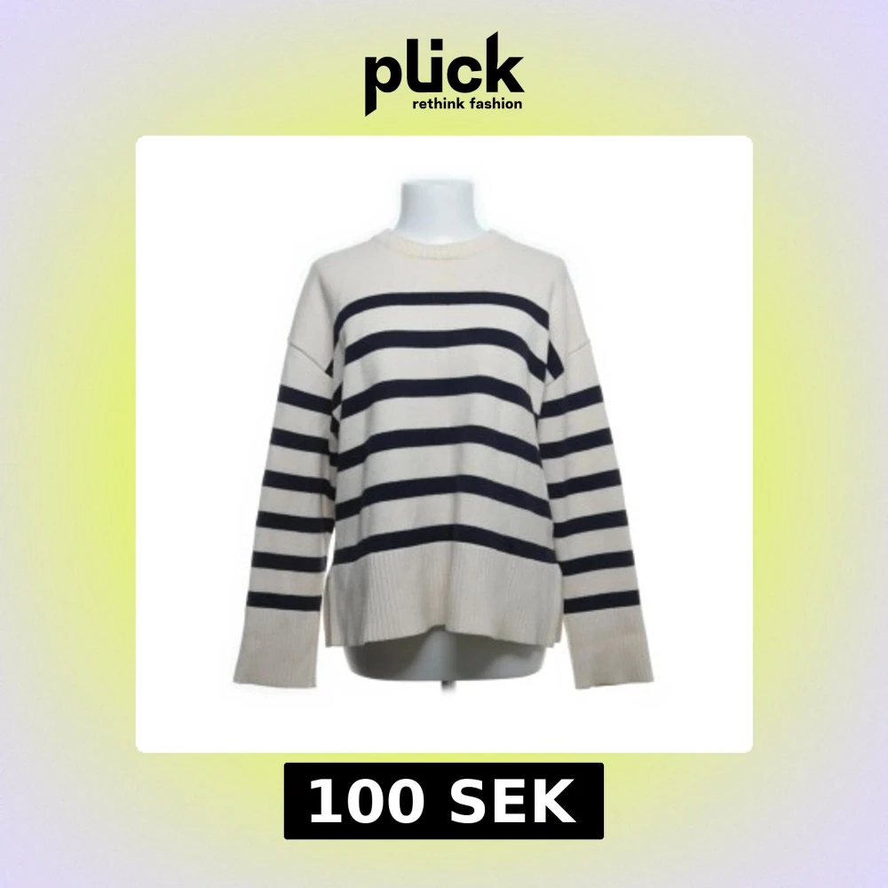 Snygg stickad tröja från Zara i beige med breda mörkblå ränder. Tröjan har en loose passform, rund halsringning och långa ärmar med ribbade muddar. Perfekt för dig som gillar en avslappnad och gosig stil.💙