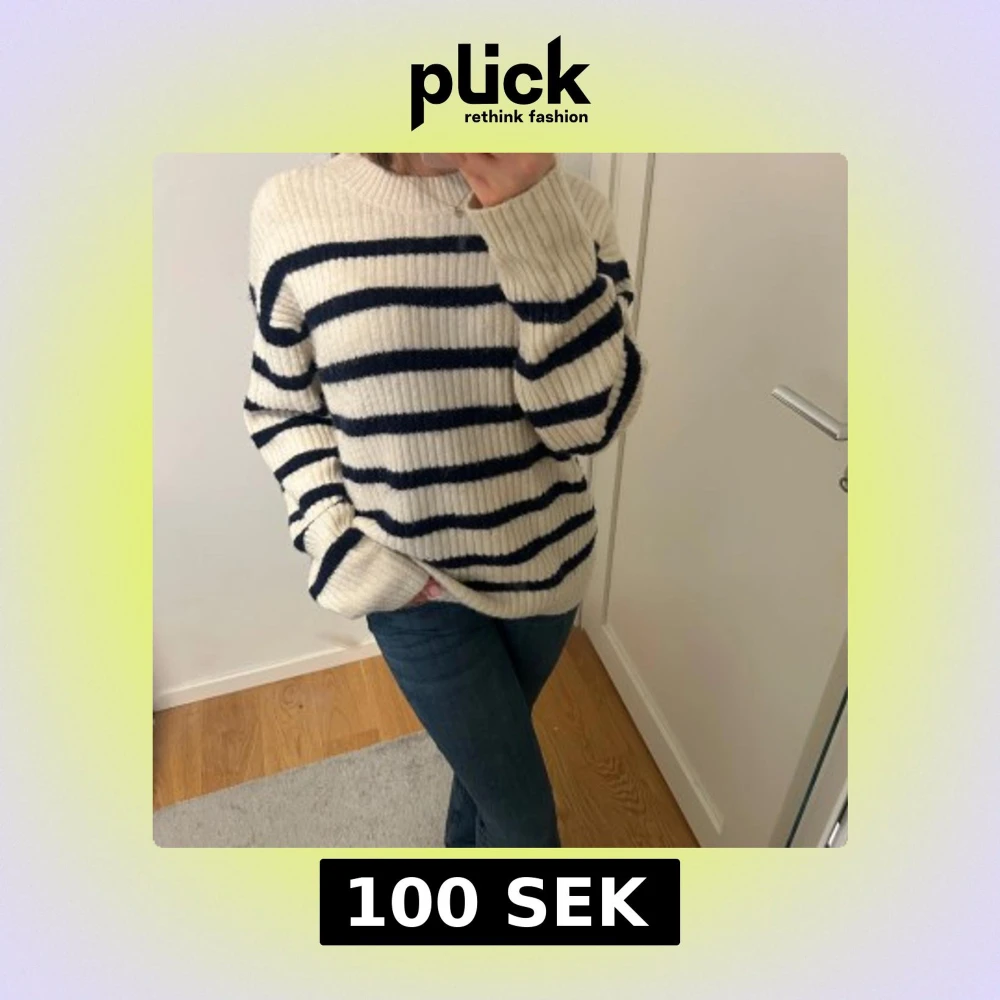 Säljer en mysig randig stickad tröja från H&M i krämvitt och marinblått. Använd ett fåtal gånger💗