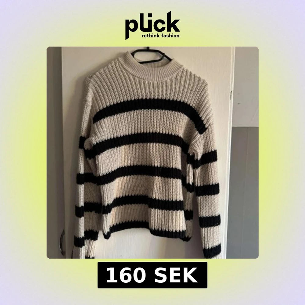 Säljer en stickad tröja med breda svarta och beige ränder. Tröjan har lång ärm, ribbad struktur och en högre krage.💕