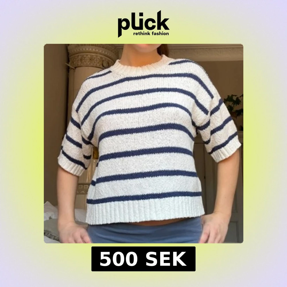 SÀljer en mysig stickad tröja med blÄ och vita rÀnder. Tröjan har en croppad passform och trekvartsÀrmar, perfekt för en avslappnad stil. Den Àr bÄde bekvÀm och stilren, idealisk för vÄr och sommar. Nypris: 800kr!
