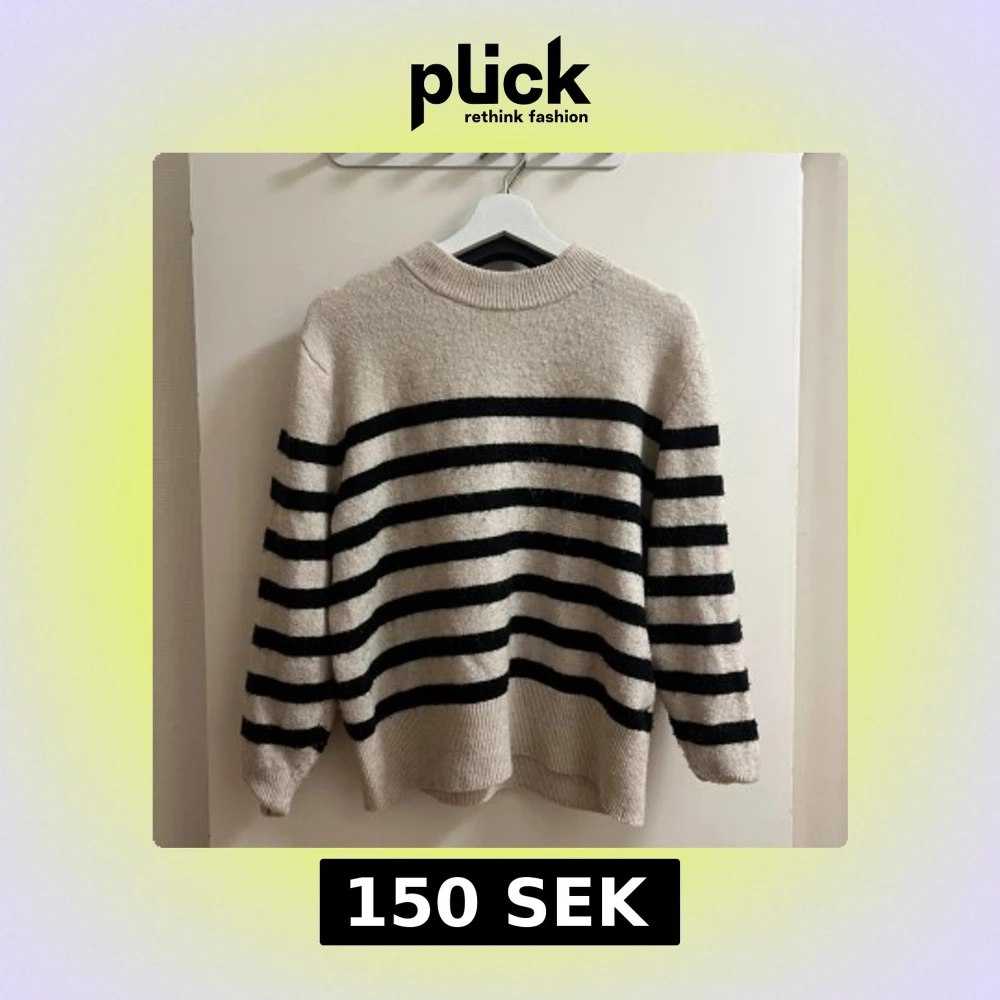 Säljer en mysig randig tröja från H&M i beige och svart. Tröjan har långa ärmar och en ribbad krage samt nederkant. Perfekt för en avslappnad stil.