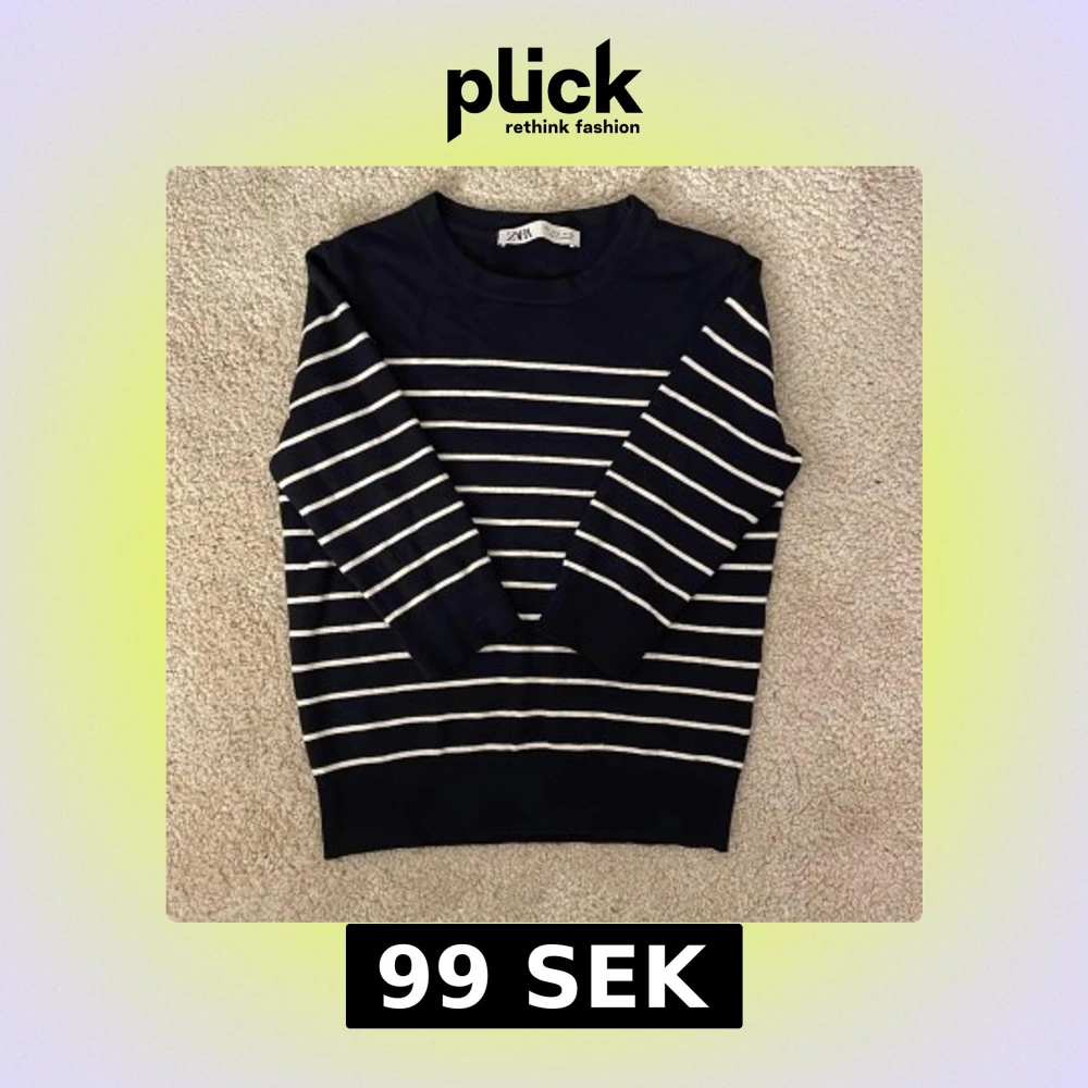 Säljer en snygg randig tröja från Zara i marinblått och vitt. Tröjan har trekvartsärmar och en klassisk rund halsringning. Perfekt för en stilren look!