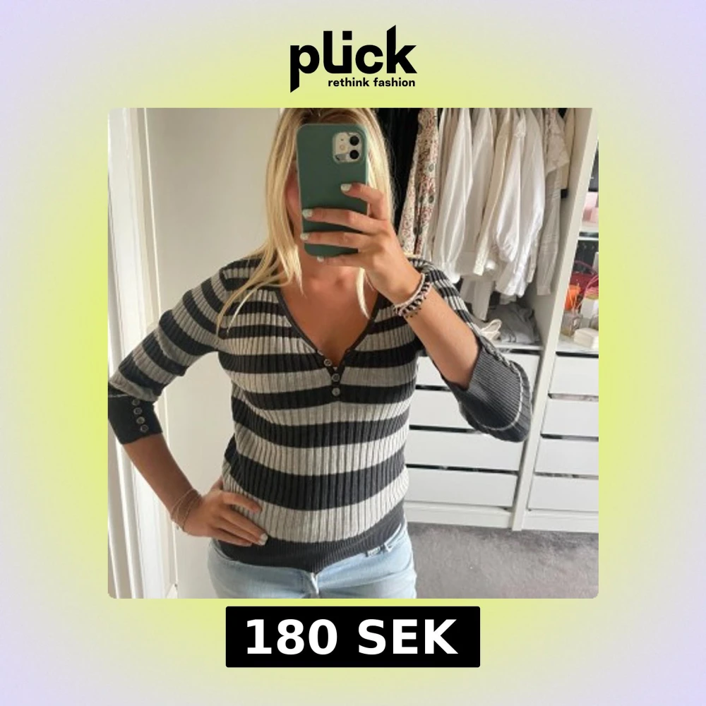 Säljer en ribbad tröja med breda svarta och grå ränder. Tröjan har v-ringning med knappar framtill och trekvartsärmar med dekorativa knappar vid ärmsluten. Sitter snyggt!!