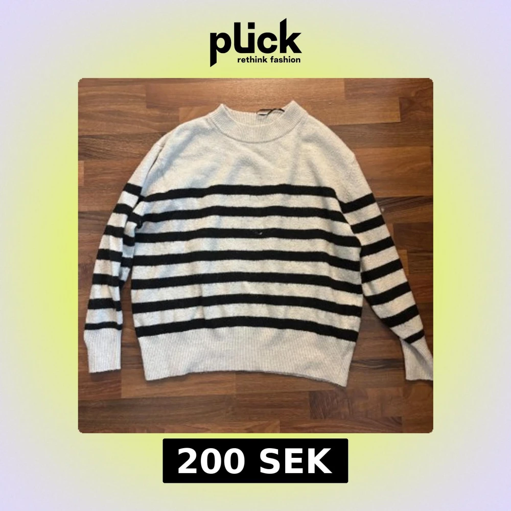 Snygg stickad tröja med breda svarta ränder på ljusgrå bas. Tröjan har rund halsringning, långa ärmar och ribbade muddar. Perfekt för dig som gillar en chill och klassisk look med lite edge.