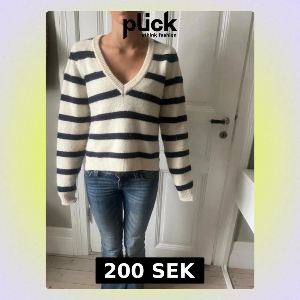 Säljer en mysig stickad tröja med breda svarta och vita ränder. Tröjan har v-ringad hals, lång ärm och ribbade muddar. Perfekt till jeans för en chill look. Passformen är normal och materialet känns mjukt och skönt.
